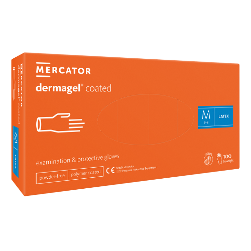 MERCATOR dermagel coated Latex Handschuhe sind puderfrei und mit einer Polymerschicht überzogen, die das Anziehen der Handschuhe mit nassen Händen erleichtert.